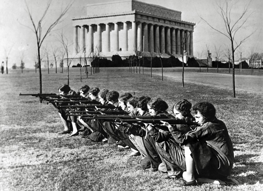 Read moreOriginal caption, from 1930: “Who'd stand up before this charming firing squad. George Washington University co-ed rifle team, who are favored to win the national title, are the crack girl shots of the country. Left to right: Helen Prentiss, Marian Stewart, Suzanne Jamison, Marjorie Folsom, Betty Clark, Mae Huntzberger, Jane Cuvillier, Grace McLean, Ermyntrude Vaiden, Helen Taylor, and Verna Parsons. The girls have placed second in the National Rifle Association intercollegiate matches for the past three years.” #