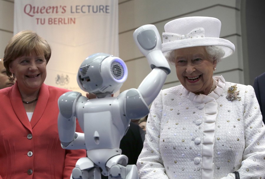 Read moreGerman Chancellor Angela Merkel (left) and Britain's Queen Elizabeth II smile as a little robot waves to the Queen during a reception at the Technische Universitaet, or Technical University, in Berlin, Germany, on June 24, 2015. #