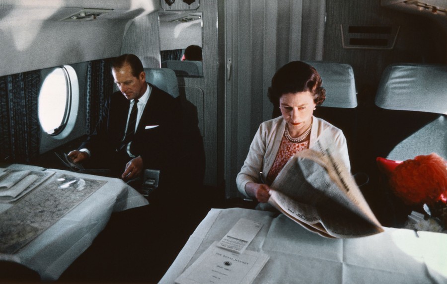 Read moreQueen Elizabeth II and Prince Philip fly back from a visit to Yorkshire in an Andover of the Queen's Flight, in a photo taken during the filming of the joint ITV-BBC film documentary, The Royal Family, in 1969. #