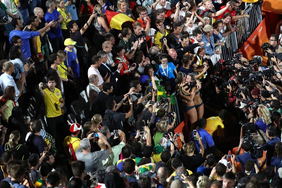 Read moreLaura Ludwig and Kira Walkenhorst of Germany are surrounded by fans and photographers as they celebrate winning gold in the Beach Volleyball Women's Gold medal match on day 12 of Rio 2016. #