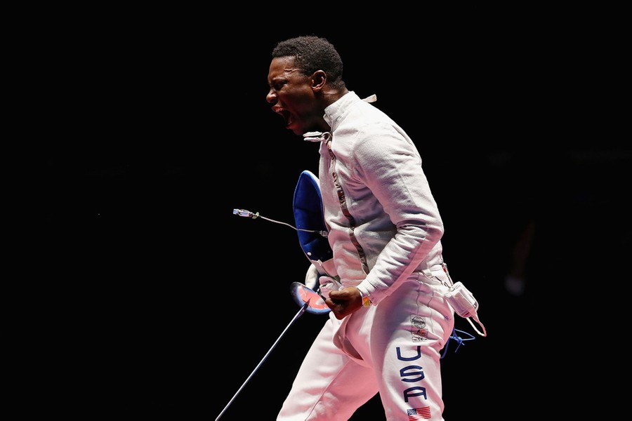 Read moreDaryl Homer of the United States celebrates victory over Mojtaba Abedini of the Islamic Republic of Iran during the men's individual sabre semifinal on Day 5 of the Rio 2016 Olympic Games. #