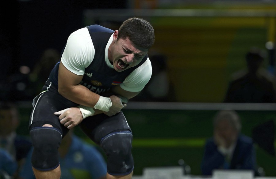 Read moreAndranik Karapetyan of Armenia, after injuring his arm while lifting in the Men's Final 77kg Weightlifting event. on August 10, 2016. While lifting a barbell above his head, his left elbow gave out, appearing to have dislocated badly. Karapetyan was taken to a local hospital and withdrew from the games. #