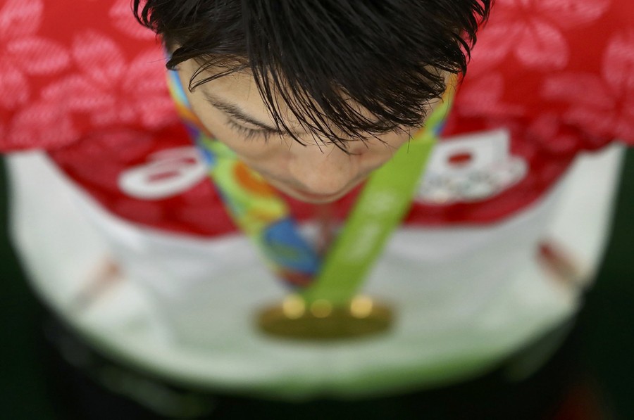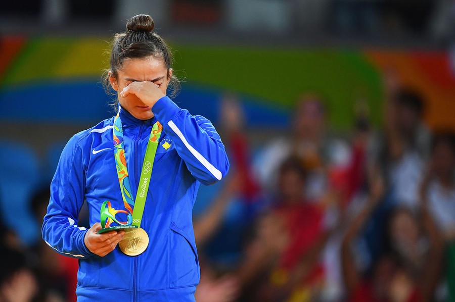 Read moreGold medalist Majlinda Kelmendi shows her emotions during the medal ceremony for the Women's 52kg Judo on Day 2 of the Rio 2016 Olympic Games. Kelmendi's win was Kosovo's first-ever gold medal in any Olympics. #