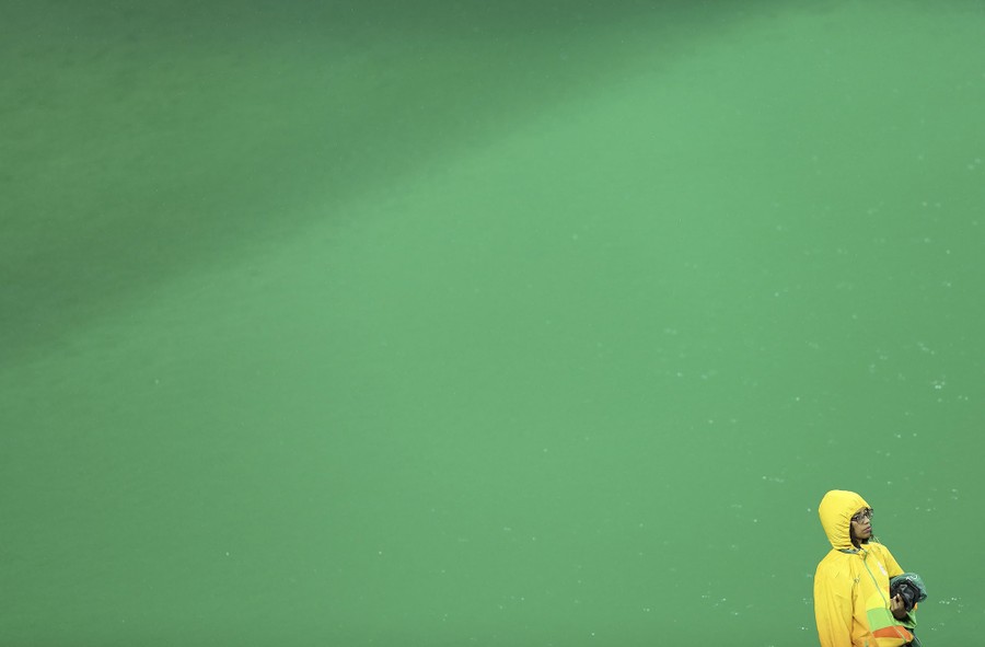 Read moreA volunteer stands next to a green-colored Olympic diving pool in the Maria Lenk Aquatics Center on August 10, 2016. The diving pool was one of two pools to have mysteriously changed colors over the course of the games. #