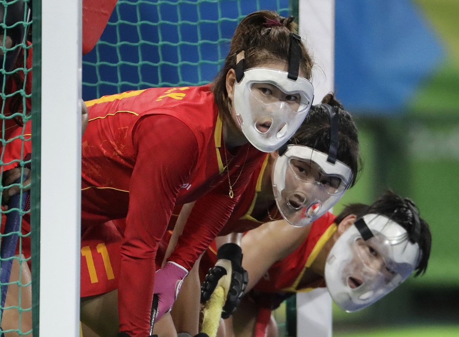 Read moreChinese hockey players wear protective face masks as they wait for a corner shot from the Netherlands during a women's field hockey match in Rio de Janeiro on August 10, 2016. #