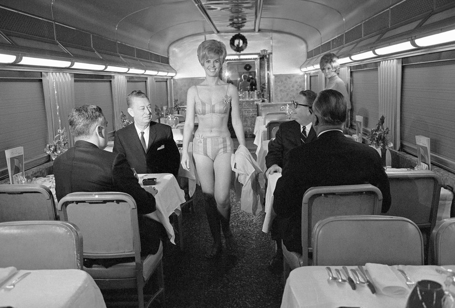 Read moreOriginal Caption: Bikini-clad Carol Herring of Anderson, South Carolina, shows hospitality to passengers on the Seaboard Coast Line's "Florida Special" train which runs between New York City and Florida. Besides pretty hostesses in bathing suits, this super-deluxe train service provides its guests with a recreation car for fashion shows, movies, television, song fests, and other diversions. #