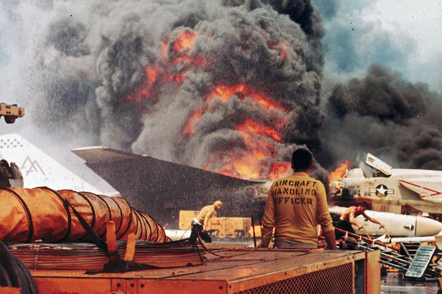 Read moreNavy crewmen try to put out a fire aboard the USS Forrestal in the Tonkin Gulf off the coast of Vietnam, on July 29, 1967, after an F-4 Phantom accidentally fired a zuni rocket into an A-4 Skyhawk which caused massive explosions on the aft end of the flight deck. This tragic accidental launch damaged the aircraft and claimed the lives of 134 crewmen. #
