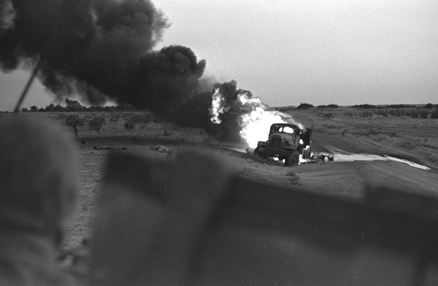 Read moreAn Egyptian military transport vehicle goes up in flames in an unknown location after being hit by an Israeli tank shell during the Six-Day War, on June 5, 1967. Fifty years ago Israel won a six-day war with Egypt, Syria and Jordan, capturing the Sinai peninsula, the Golan Heights, the Gaza Strip and the West Bank. #