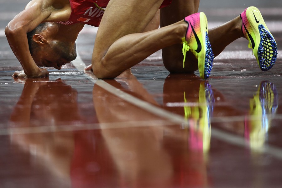 Read moreBahrain's Sadik Mikhou reacts after the Men's 1,500 meter at the Olympic Stadium in Baku on May 20, 2017. #