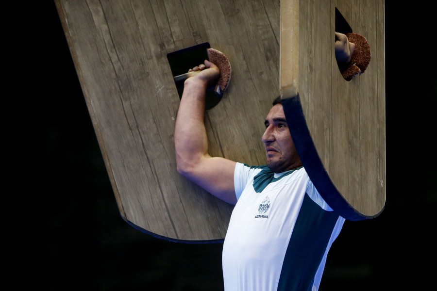 Read moreAzerbaijan's Rufat Gulaliyev competes in the Zurkhaneh event Sang at Heydar Aliyev Arena on May 21, 2017. #