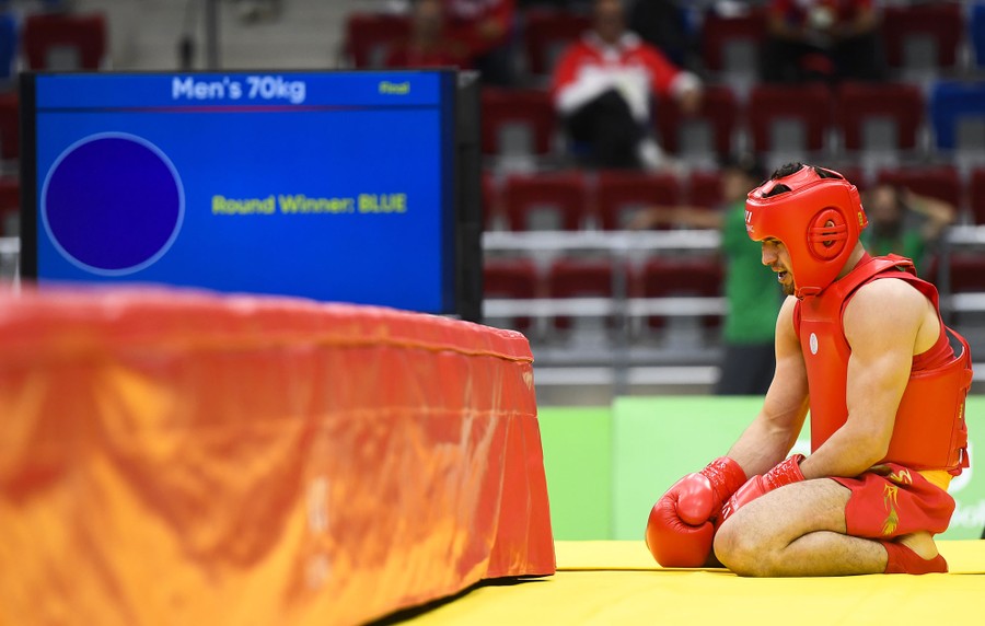 Read moreAzerbaijan's Vugar Karamov reacts after losing the Men's 70 kilogram Wushu event at the Baku Sports Hall on May 22, 2017. #