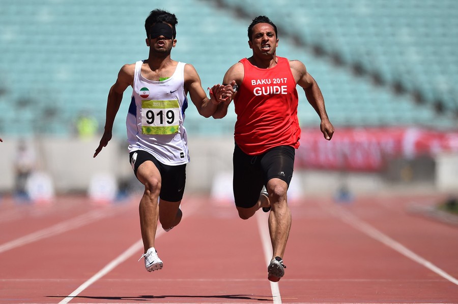 Read moreIran's Arash Khosravi competes with his guide Javad Marghashi (right) during the Men's 100 meter T11 at the Olympic Stadium in Baku on May 18, 2017. #