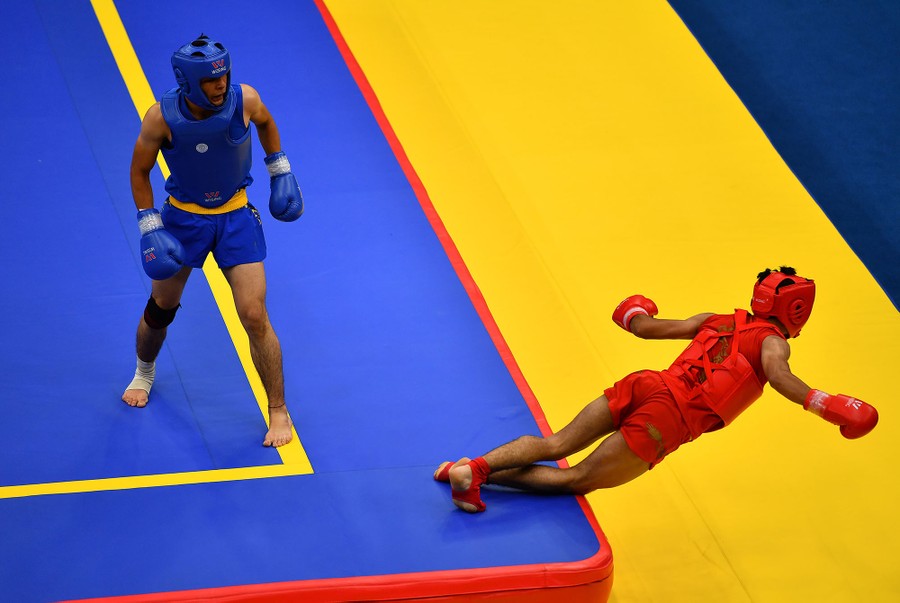 Read moreHamza Yahia of Jordan (red) competes against Annageldi Agamyradov of Turkmenistan in the Men's Wushu 56 kilogram quarter final during Day 9 of Baku 2017. #