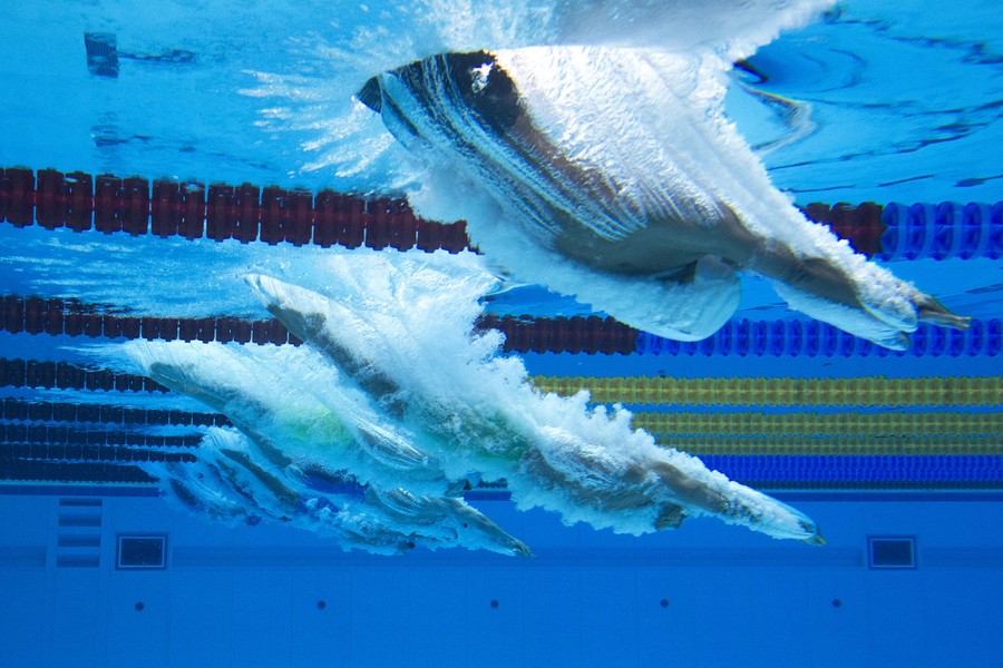 Read moreSwimmers dive during the Men's Swimming 100-meter breaststroke event at the Baku Aquatic Center on May 15, 2017. #