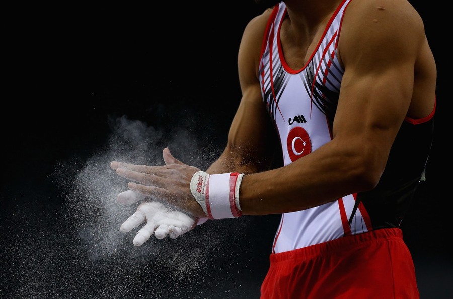 Read moreFerhat Arican of Turkey chalks his hands prior to competing in the Men's Pommel Horse qualification during Day 3 of Baku 2017. #