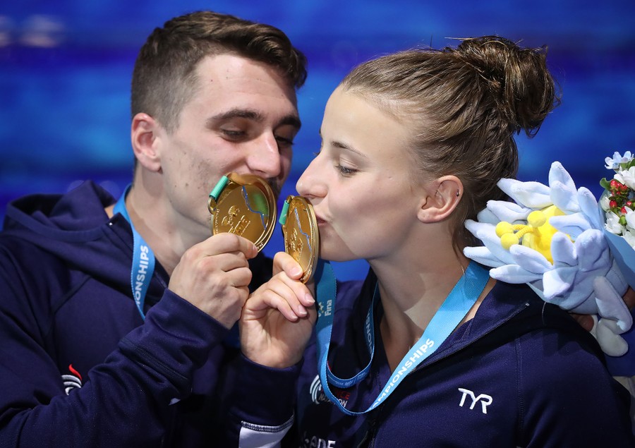 Read moreGold medalists Laura Marino and Mattieu Rosset of France pose with the medals won during the Mixed Diving Team final on day five of the Budapest 2017 FINA World Championships. #