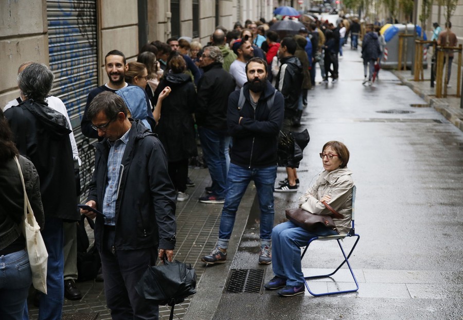 Read morePeople wait to vote outside a school listed as a polling station by the Catalan government in Barcelona on October 1, 2017. Catalan pro-referendum supporters vowed to ignore a police ultimatum to leave the schools they are occupying to use in a vote seeking independence from Spain. #