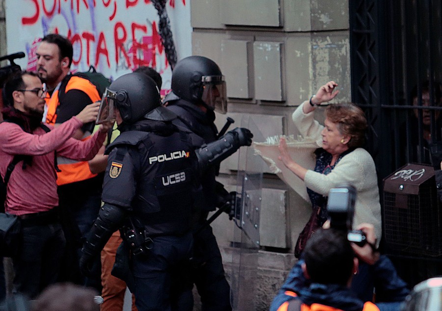 Read moreA woman is removed by force as police move in on crowds at a polling station where Catalonian President Carles Puigdemont planned to vote on October 1, 2017, in Sant Julia de Ramis, Spain. #