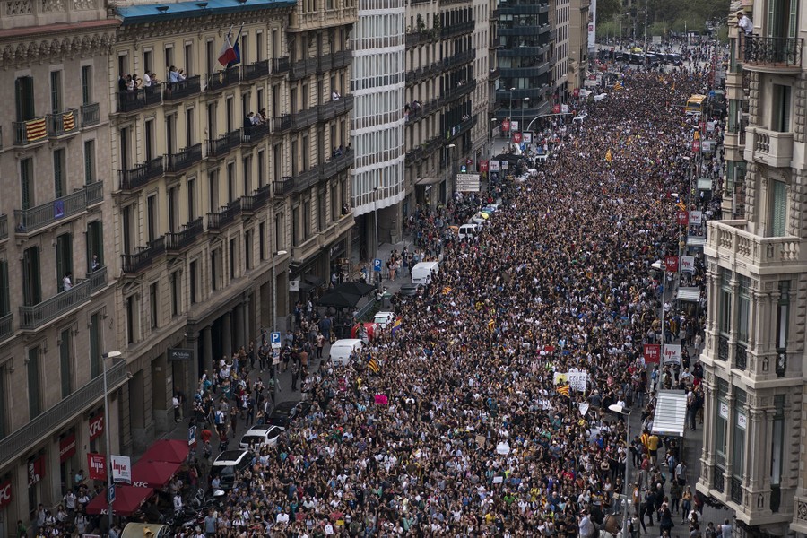Read moreCatalan independence supporters march during a demonstration in downtown Barcelona, Spain, on October 2, 2017. Catalan leaders accused Spanish police of brutality and repression when they attempted to stop voting from taking place on Sunday, while the Spanish government praised the security forces for behaving firmly and proportionately. Videos and photographs of the police actions were on the front page of news media outlets around the world. #