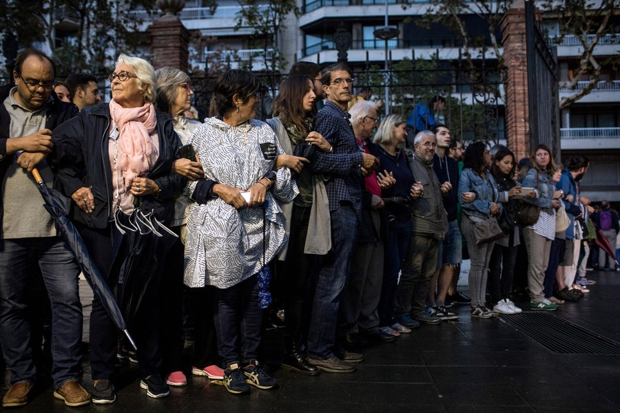 Read morePeople join arms as they clear a path for the arrival of the official ballot boxes to arrive at the Escola Industrial of Barcelona polling station on October 1, 2017. #