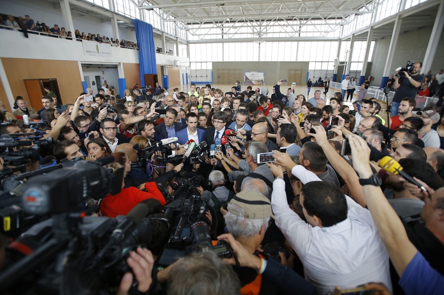 Read moreCatalan President Carles Puigdemont, center, speaks to the media at a sports center, assigned to be a polling station, in Sant Julia de Ramis, Spain, on October 1, 2017. #