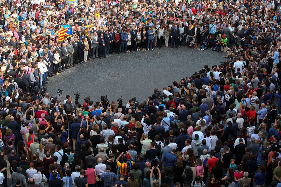 Read moreCatalan regional government members and local politicians stand in Plaza Sant Jaume as they join a protest called by pro-independence groups for citizens to gather at noon in front of city halls throughout Catalonia, in Barcelona, on October 2, 2017. #