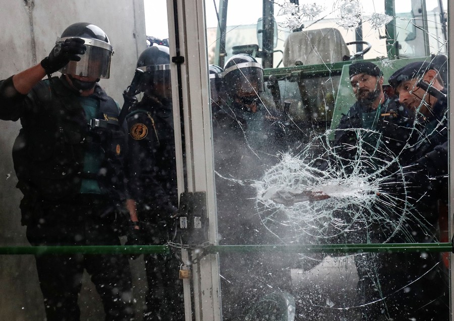 Read moreSpanish Civil Guard officers break through a door at a polling station for the banned independence referendum, where Catalan President Carles Puigdemont was supposed to vote, in Sant Julia de Ramis, Spain, on October 1, 2017. #