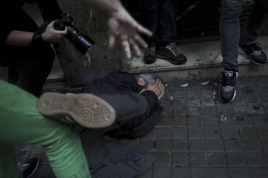Read moreA protester falls on the ground after being hit in the face by a rubber bullet shot by Spanish National Police near the Ramon Llull school polling station on October 1, 2017. #