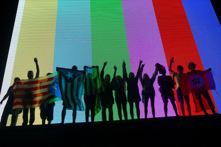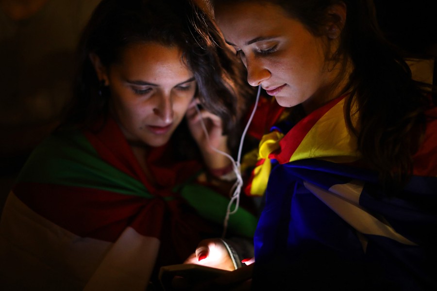 Read moreYoung supporters wave esteledas, or Catalonian independence flags, and shout slogans in front of a giant screen at the end of the "Yes" vote closing campaign in Barcelona on September 29, 2017. #