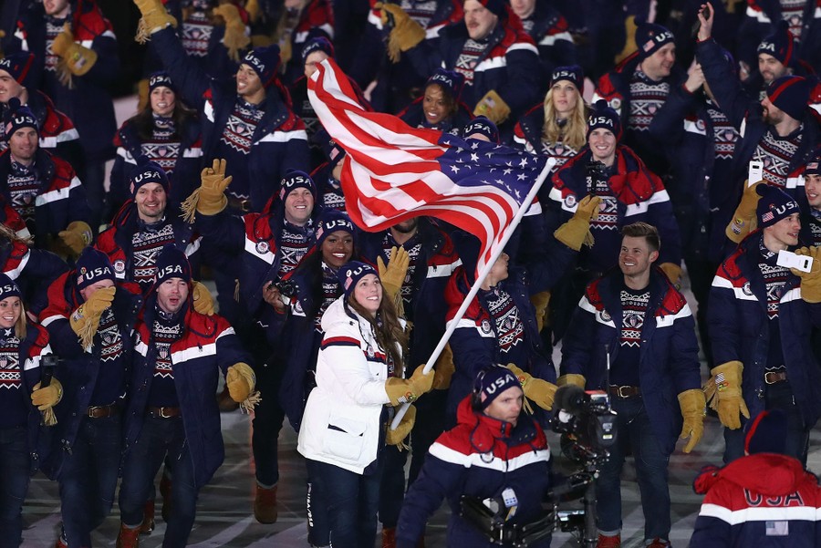 Read moreFlag bearer Erin Hamlin of the United States leads her teammates into Pyeongchang Olympic Stadium on February 9, 2018. #