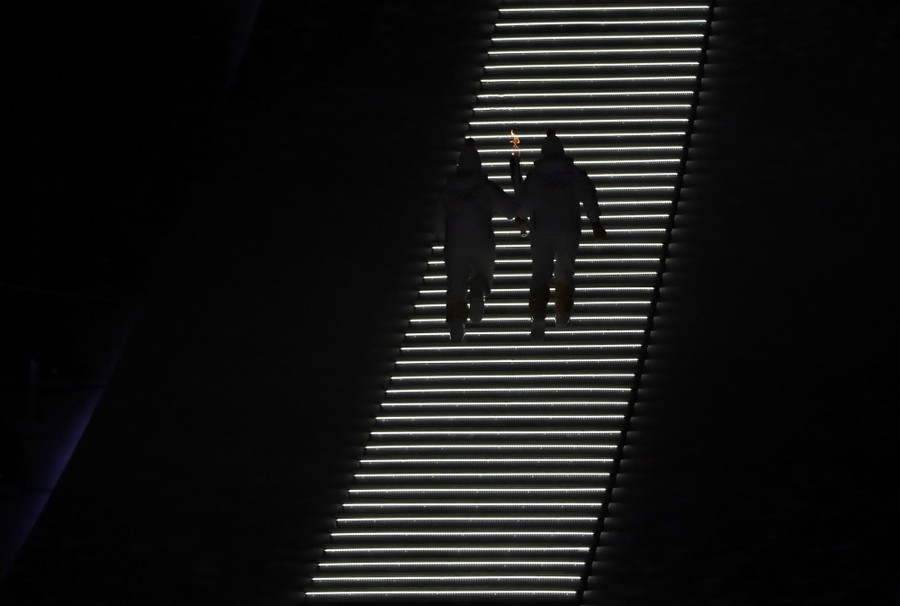Read moreNorth Korea's Jong Su Hyon, left, and South Korea's Park Jong-ah carry the torch to the top of the stadium on February 9, 2018. #