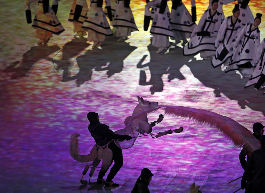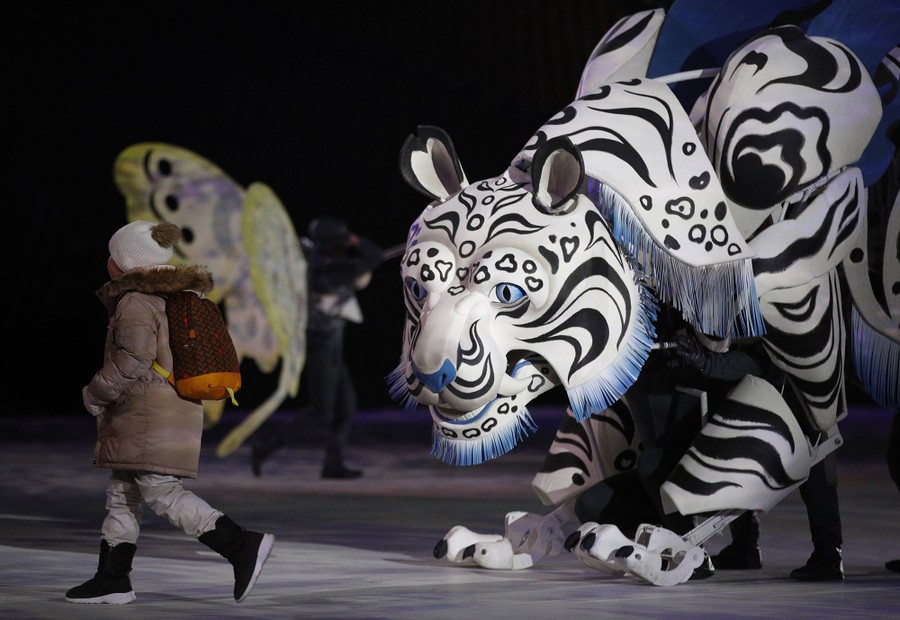 Read moreA white tiger puppet walks the stage during the opening ceremony on February 9, 2018. #