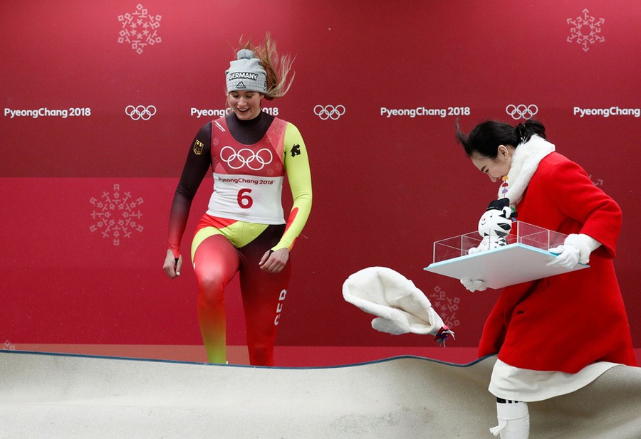 Read moreGold medalist in the women's singles luge competition, Natalie Geisenberger of Germany arrives at the victory ceremony at the Olympic Sliding Center as strong winds blow the hat from the head of a hostess on February 13, 2018. #