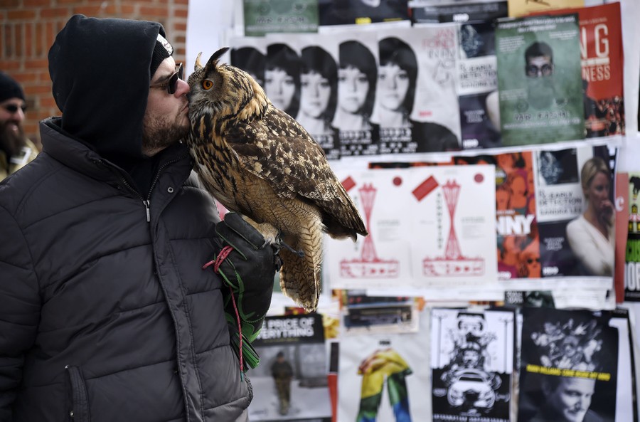 Read moreEric McGill, of the bird education and conservation company Earthwings, kisses his eagle-owl "Pumpkin" as he meets with festival goers on Main Street during day five of the 2018 Sundance Film Festival on January 22, 2018, in Park City, Utah. #