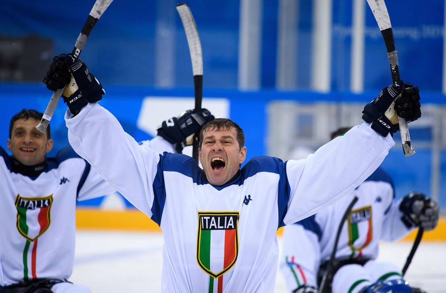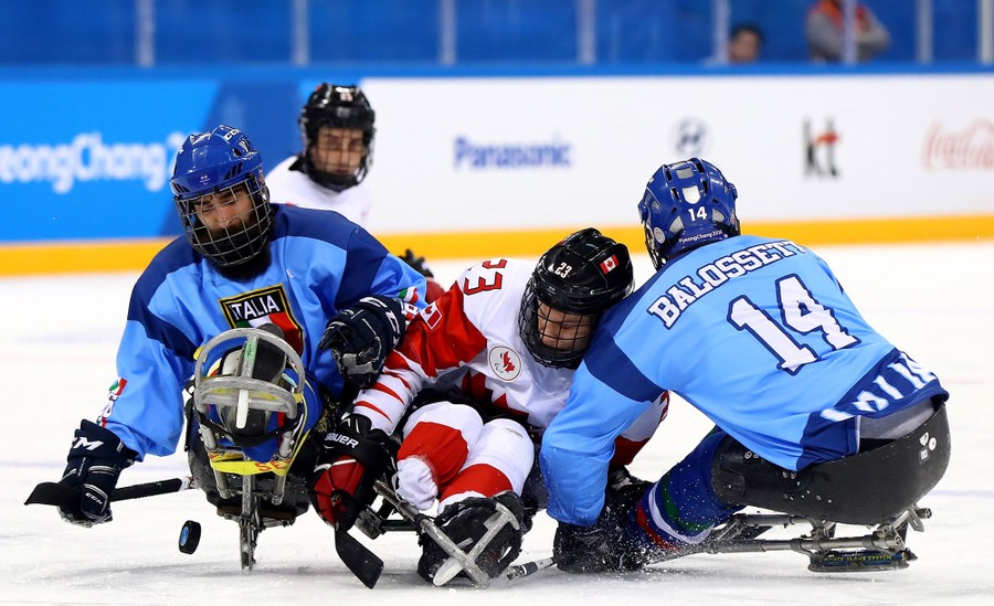 Read moreLiam Hickey (#23) of Canada battles for the puck with Bruno Balossetti (#14) of Italy in the ice hockey preliminary round group A game between Canada and Italy during day two of the 2018 Winter Paralympics. #