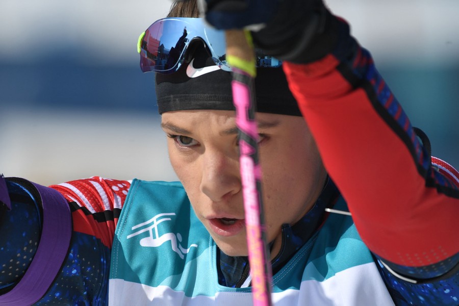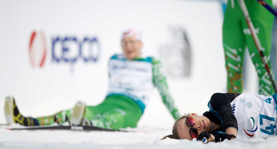 Read moreJasmin Bambur of the U.S. reacts after crossing the finish line during the alpine skiing men's super-G sitting event at the Jeongseon Alpine Center on March 13, 2018. #