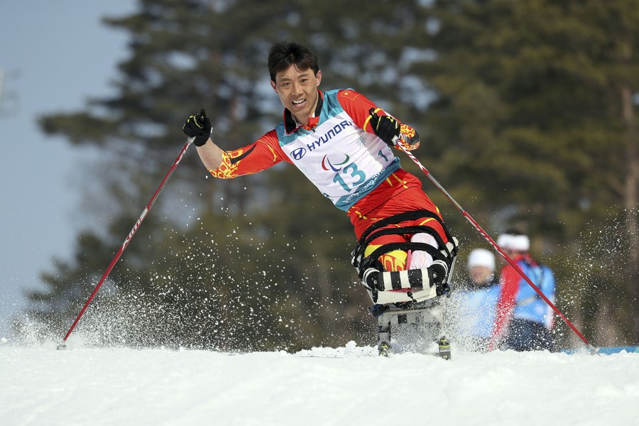 Read moreGao Xiaoming of China races in the cross-country skiing sitting men's 15-kilometer event, in which he later won the gold medal, at the Alpensia Biathlon Center on March 11, 2018. #