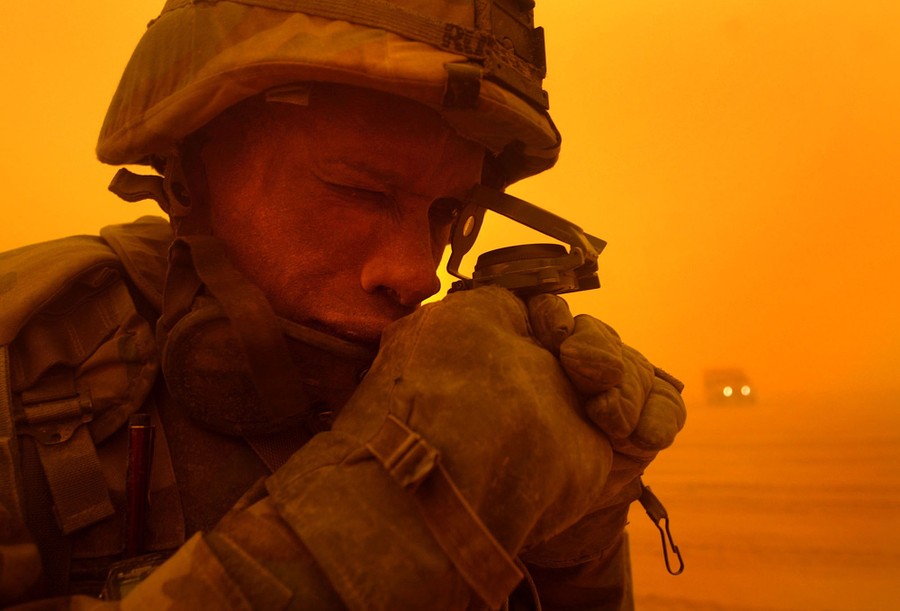 Read moreU.S. Army engineer, Sergeant First Class Russel, consults his compass to find direction between the cities of Najaf and Karbala, Iraq, as a sandstorm turned the daylight orange in the opening week of the Iraq War, on March 26, 2003. #