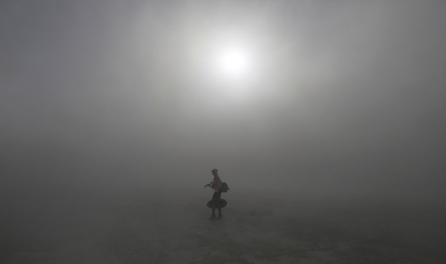 Read moreA Burning Man participant walks through a desert dust storm in formal clothes on her way to a wedding in the middle of the desert on the third day of the Burning Man arts and music festival in the Black Rock Desert of Nevada, on August 30, 2017. #