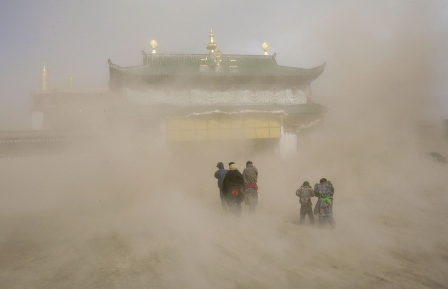 Read moreEthnic Tibetan worshippers enter a monastery to celebrate Monlam, or Great Prayer Festival, during a sandstorm in Aba, Sichuan province, China, on February 17, 2008. #
