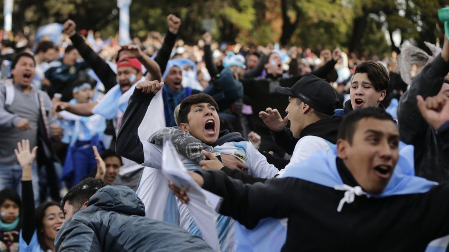 Read moreFans of Argentina celebrate as they watch the FIFA World Cup Russia 2018 match between Argentina and Nigeria on a giant screen at Plaza San Martin in Buenos Aires on June 26, 2018. Argentina won 2-1. #