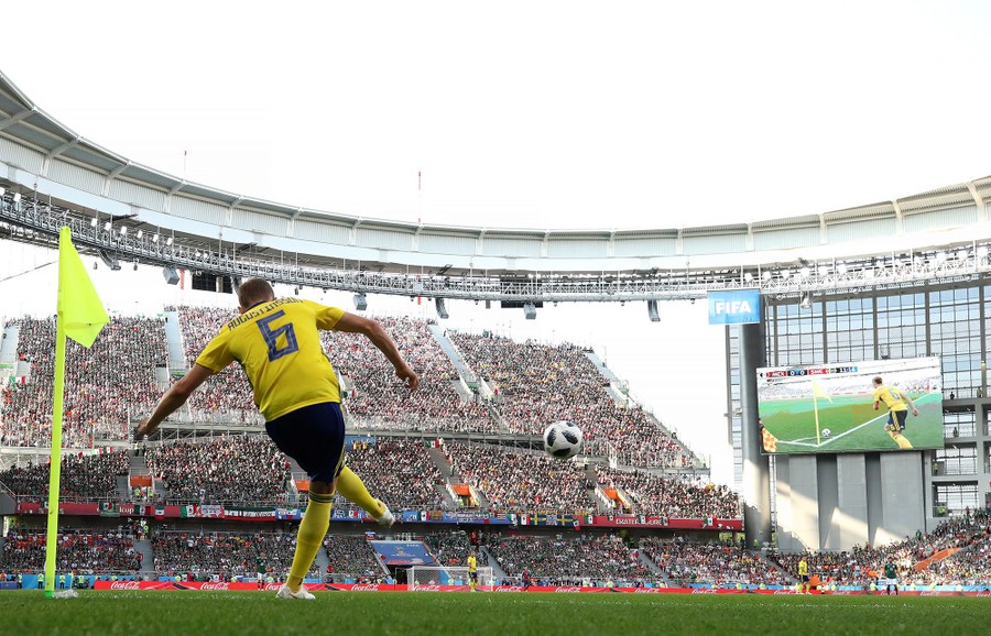 Read moreLudwig Augustinsson of Sweden takes a corner kick during the 2018 FIFA World Cup Russia Group F match between Mexico and Sweden at Ekaterinburg Arena on June 27, 2018. #
