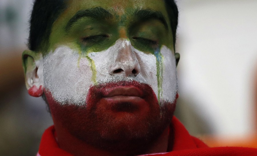 Read moreAn Iranian fan, whose face paint has run, closes his eyes for a moment after the end of the Group B match between Iran and Portugal at Mordovia Arena in Saransk, Russia, on June 25, 2018. The game ended 1-1, with Iran not progressing. #