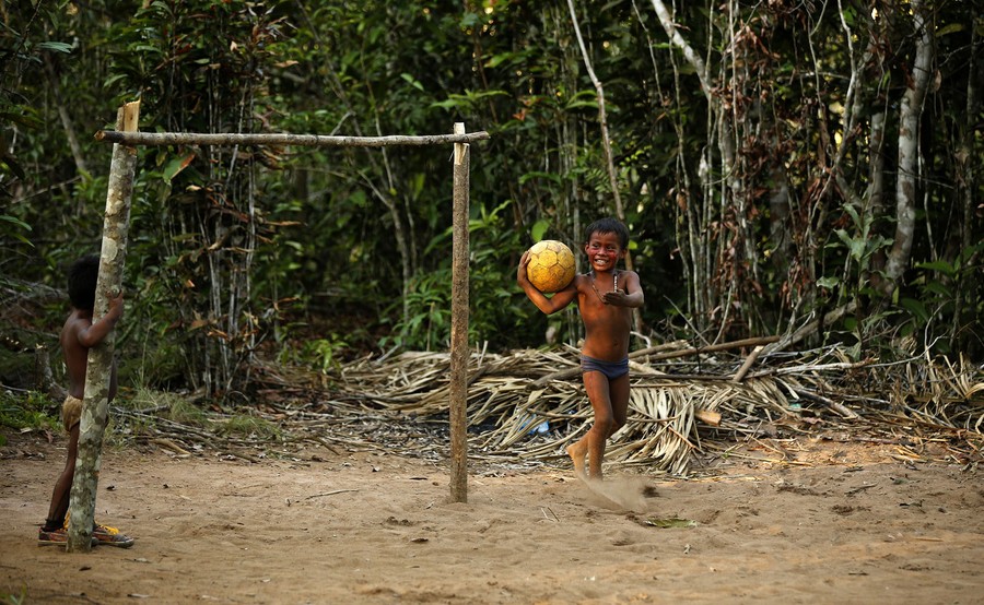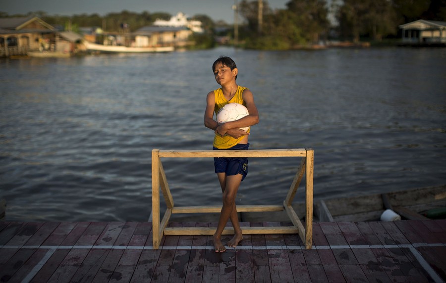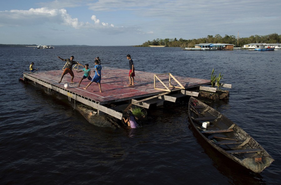 Read moreBoys play soccer on a driftwood soccer court on the banks of the Rio Negro in Catalao community near Manaus, Brazil, on April 4, 2015. Residents of Catalao, a village of houseboats, built a floating wooden soccer court after their village field was flooded by the swollen Rio Negro. #