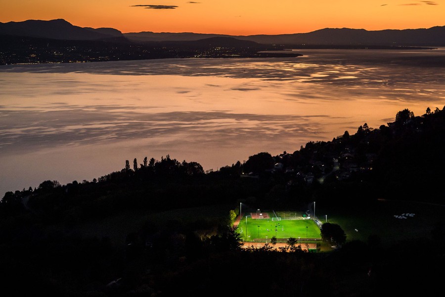 Read moreA picture taken on October 5, 2017, from the Mont de Gourze in Riez, western Switzerland, shows a football pitch illuminated with floodlights at sunset above the Lake Geneva. #