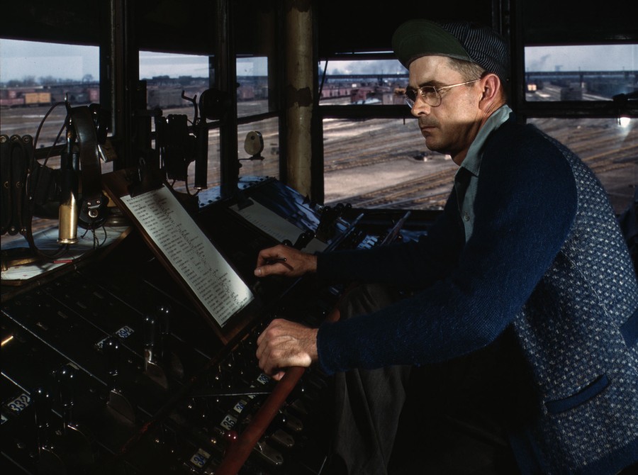 Read moreThe Chicago and North Western Railroad tower man R. W. Mayberry of Elmhurst, Illinois, at work in the Proviso yard in May 1943. He operates a set of retarders and switches at the hump. #