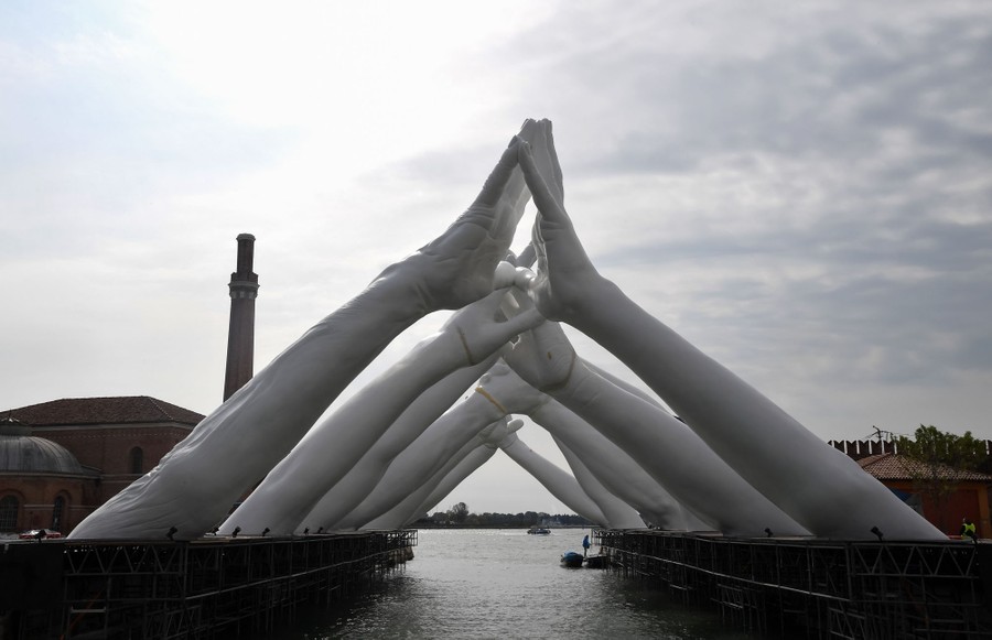 Read moreA general view shows the Italian artist Lorenzo Quinn's Building Bridges, a sculptural installation showing six pairs of arching hands creating a bridge over a Venetian waterway in the Arsenal former shipyard, in Venice on May 8, 2019. #