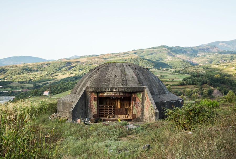 During the Cold War, Enver Hoxha, the hard-line leader of the People’s Socialist Republic of Albania, embraced isolationist and paranoid views, leading to the launch of a massive “bunkerization” project to defend the nation in 1968. Over 20 years, nearly 175,000 reinforced concrete bunkers were built across Albania, lining seashores and lakes, and dotting mountain passes, borders, farmland, and towns—at great expense and effort. However, these bunkers were never used as intended: They never sheltered the populace from a Soviet attack or an invasion by a neighbor, though they did see limited use during the Kosovo War and Albanian Civil War in the 1990s. In recent years, a few of the disused structures have been converted into hostels, homes, or museums, and many have been removed altogether, but most continue to slowly decay in place.
