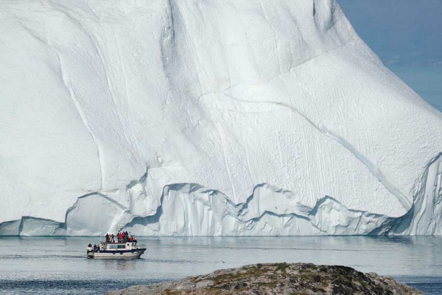 Read moreA boat carrying tourists motors past an iceberg at the mouth of the Ilulissat Icefjord during unseasonably warm weather near Ilulissat, Greenland, on July 30, 2019. The Sahara heat wave that recently sent temperatures to record levels in parts of Europe is arriving in Greenland. Climate change is having a profound effect in the country, where summers in the past several decades have become longer and the rate at which glaciers and the Greenland ice cap are retreating has accelerated. #