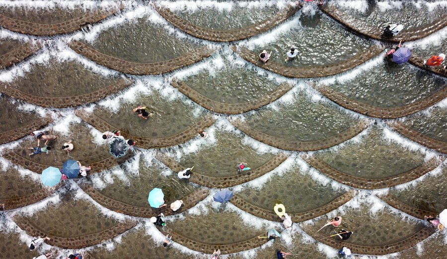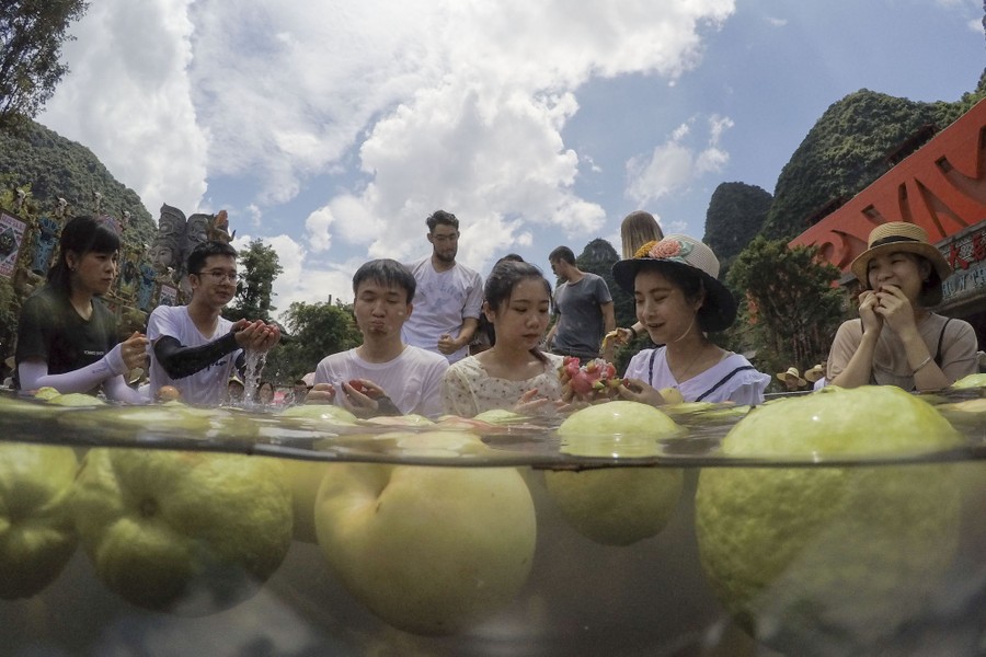 Read moreTourists eat fruit in a giant ice bucket to cool down on a hot summer day at a tourist attraction in Guilin, Guangxi Zhuang Autonomous Region, China, on July 25, 2019. #